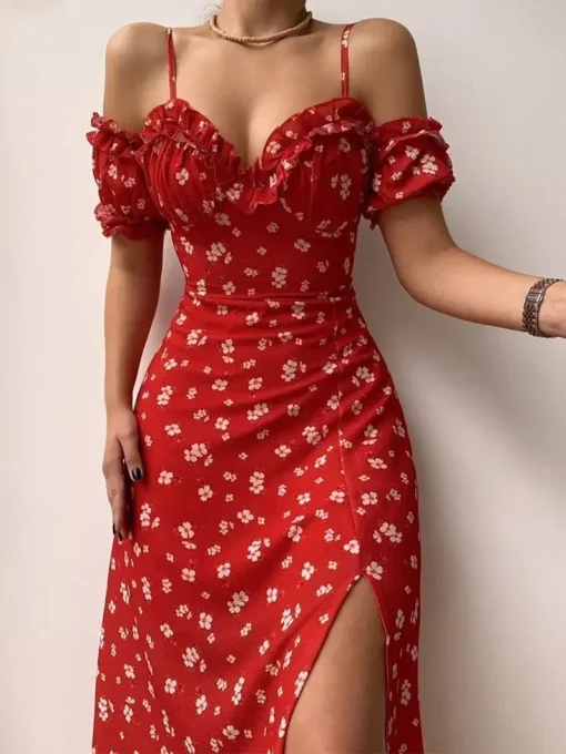 Women’s Bohemian Floral Dress Lace Ruffle Trim Sleeveless Spaghetti Strap V Neck Flowy A-Line Long Dress for Summer Party