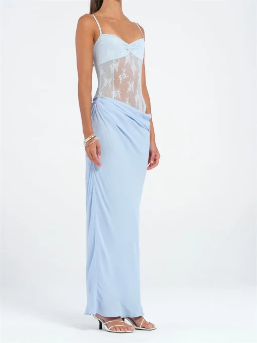 Women Beaded Flower Cami Dress Glitter Sequin Spaghetti Strap Open Back High Split Long Dress for Party Club