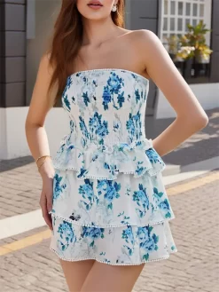 Women Mini Dress, Strapless Backless Floral Layered Slim Fit Summer Tube Dress Clubwear