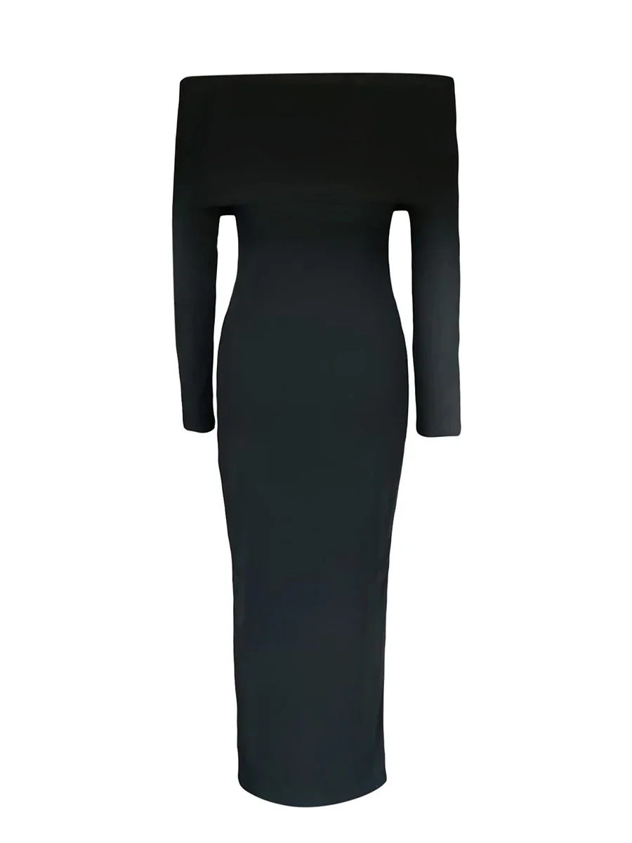 Women’s Long Fitted Evening Dress Black Long Sleeve Off Shoulder Strapless Party Dress