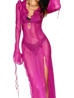 Women Mesh Sheer Long Dress, Long Sleeve V Neck See-through Slit Dress for Party Beach Cover-ups Dresses