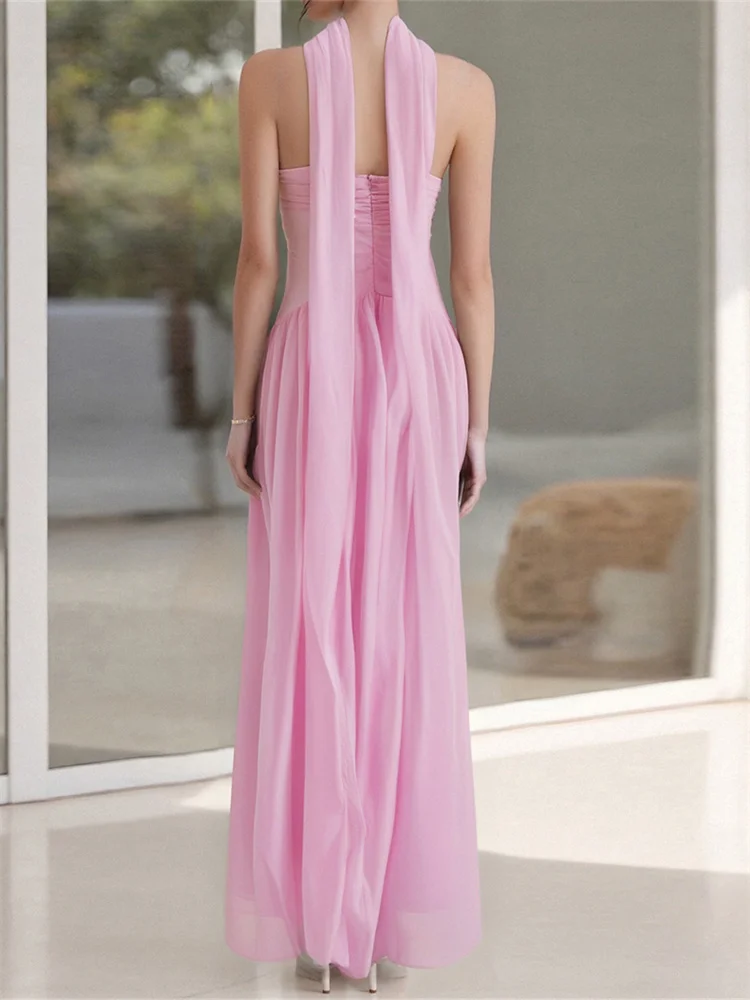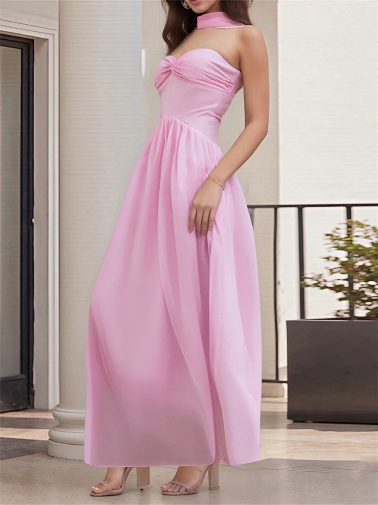 Women Long Dress Solid Color Tube Dress Summer Fashion Backless Casual Strapless Dress with Choker Scarf