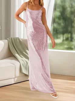 Shiny sequins, sleeveless, adjustable spaghetti straps, draped back and backless; Summer dresses for women; Beach dresses for women, ankle length design, make your legs longer and slimmer