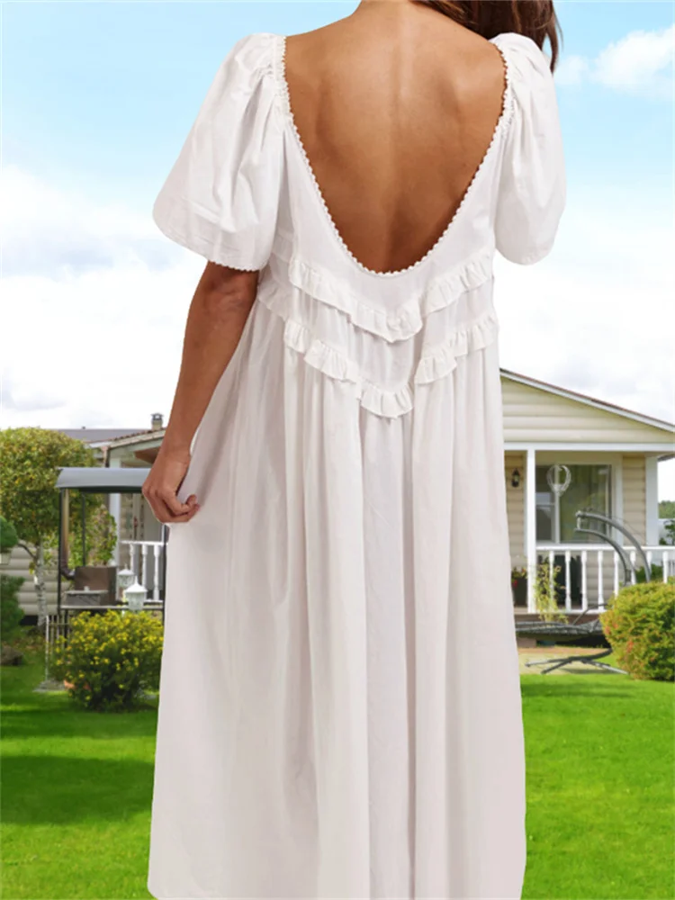 Women Long Dress, Elegant Short Sleeve Low-cut Backless Solid/Plaid Loose Swing Dress
