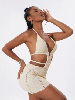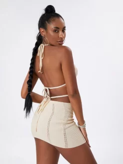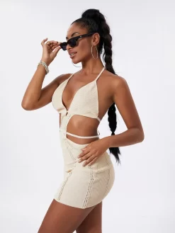 Women’s Halter Bodycon Mini Dress, Sleeveless Tie Backless Hollow Out Knit Beach Dress