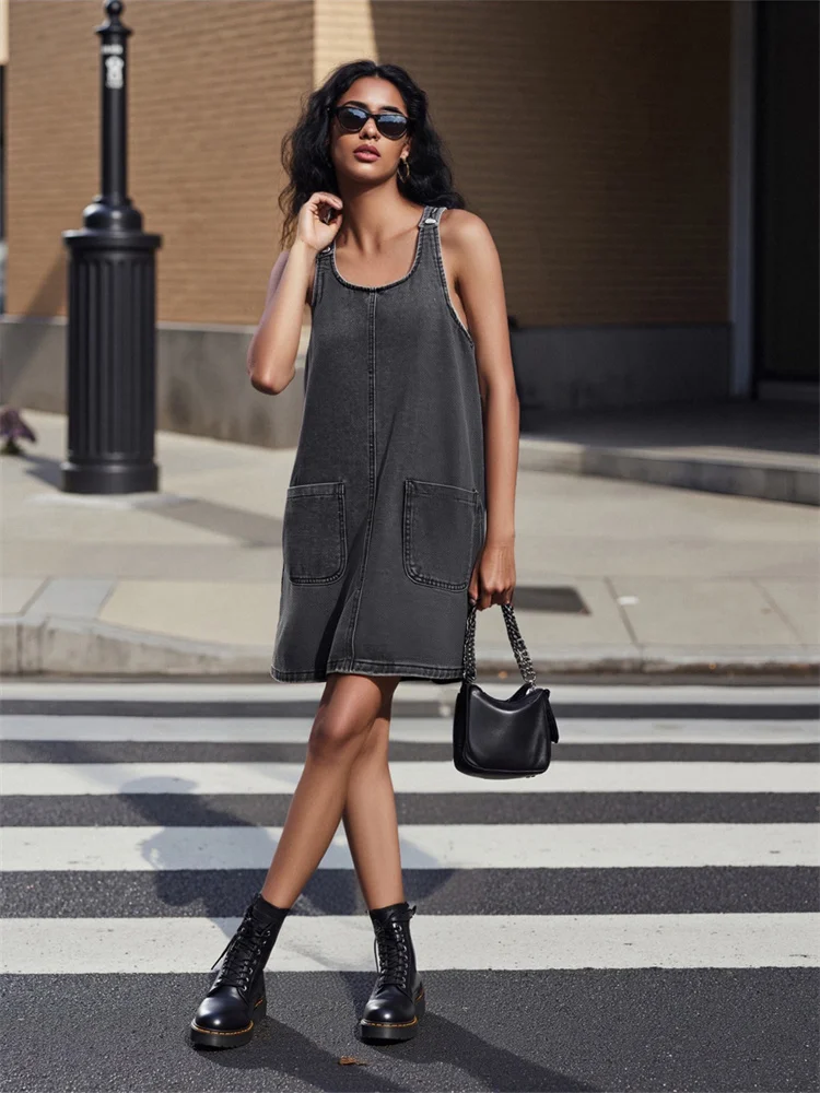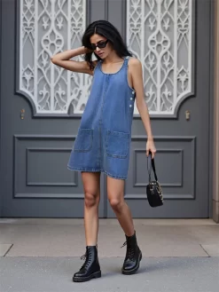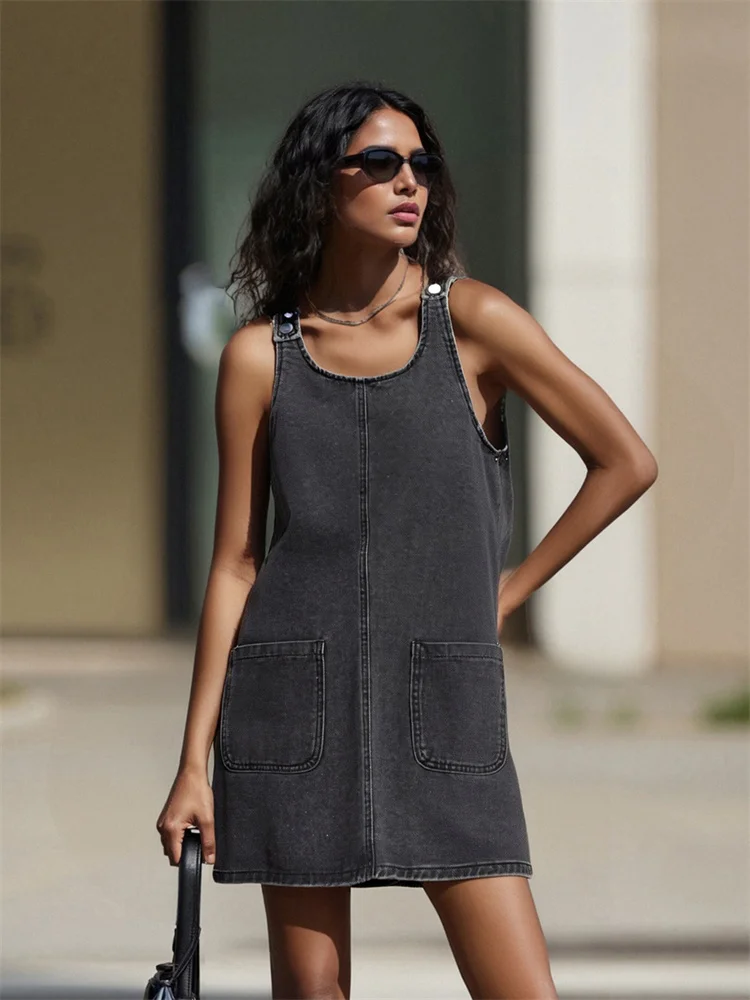 Women’s Summer Denim Tank Dress Sleeveless Solid Color U Neck Jeans Dress