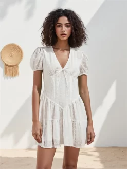 Women White Mini Dress Short Sleeve V Neck Eyelet Hollowed Solid A-line Dress Summer Dress for Daily Party