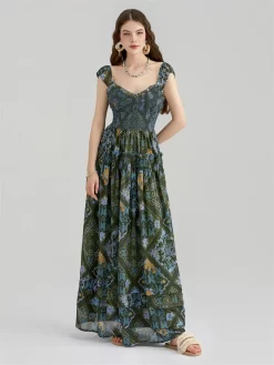 Women’s Floral Long Dress Cap Sleeve Square Neck Smocked Waist Flowy A-line Dress Summer Bohemian Retro Holiday Sundress
