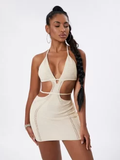 Women’s Beach Knit Dress Tie-ups Backless Halter V Neck Cut Out Bodycon Mini Dress Sleeveless Sundress Summer