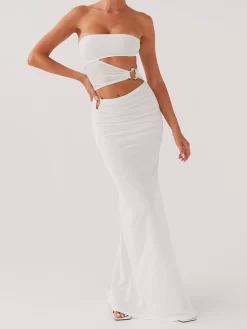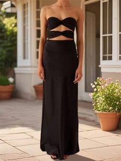 Women’s Strapless Tube Dress Solid Color Hollow Out Bodycon Long Dress for Party Evening Elegant Summer Dresses