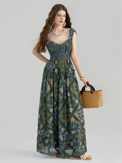 Women’s Summer Floral Print Cami Dress Sleeveless Spaghetti Strap Cowl Neck Back Cross Slim Fit Long Dress
