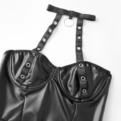 Women’s PU Leather Dress Set Cutout Metal Ring Chain Halter Pleated Mini Dress with Thong 2 Pcs Sets Summer Sexy Dresses